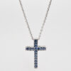 This blue sapphire cross pendant has 17 sapphires that have a total weight of 33pts and is set in 2.57 grams of platinum on a platinum chain...