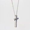 This blue sapphire cross pendant has 17 sapphires that have a total weight of 33pts and is set in 2.57 grams of platinum on a platinum chain